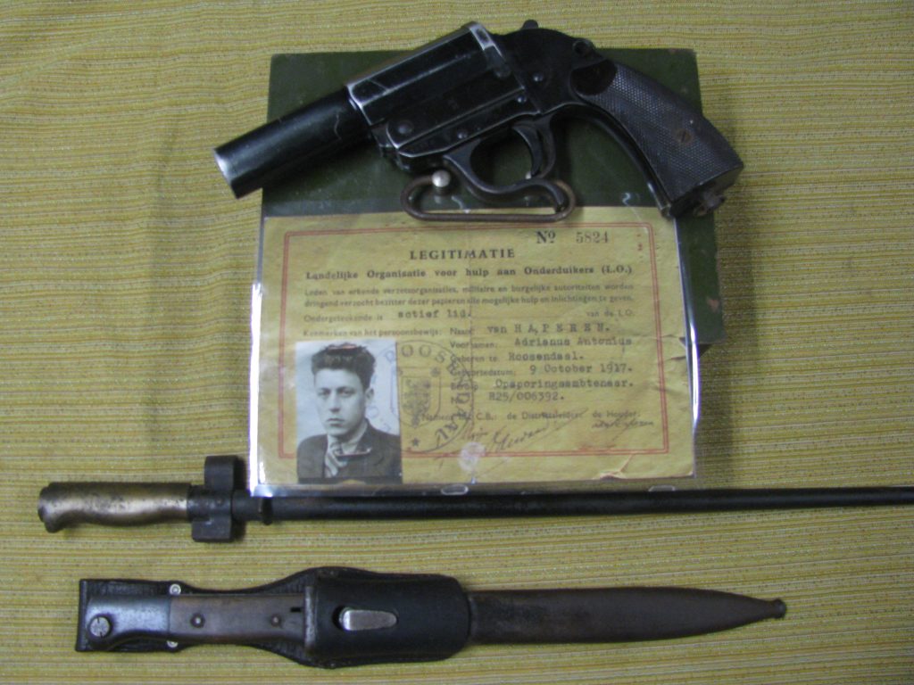 Het betreft hier de legitimatie van Janus van Haperen als lid van de Landelijke Organisatie voor hulp aan Onderduikers (L.O.), een Franse (Lebel M1886) en Duitse bajonet (K98) en een Duits seinpistool (Leuchtpistole 34).